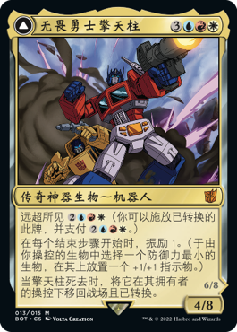 变形金刚牌张使用系列代码「BOT」,并有其系列符号。这些牌不可用于标准赛,但可用于指挥官、薪传与特选赛事中。