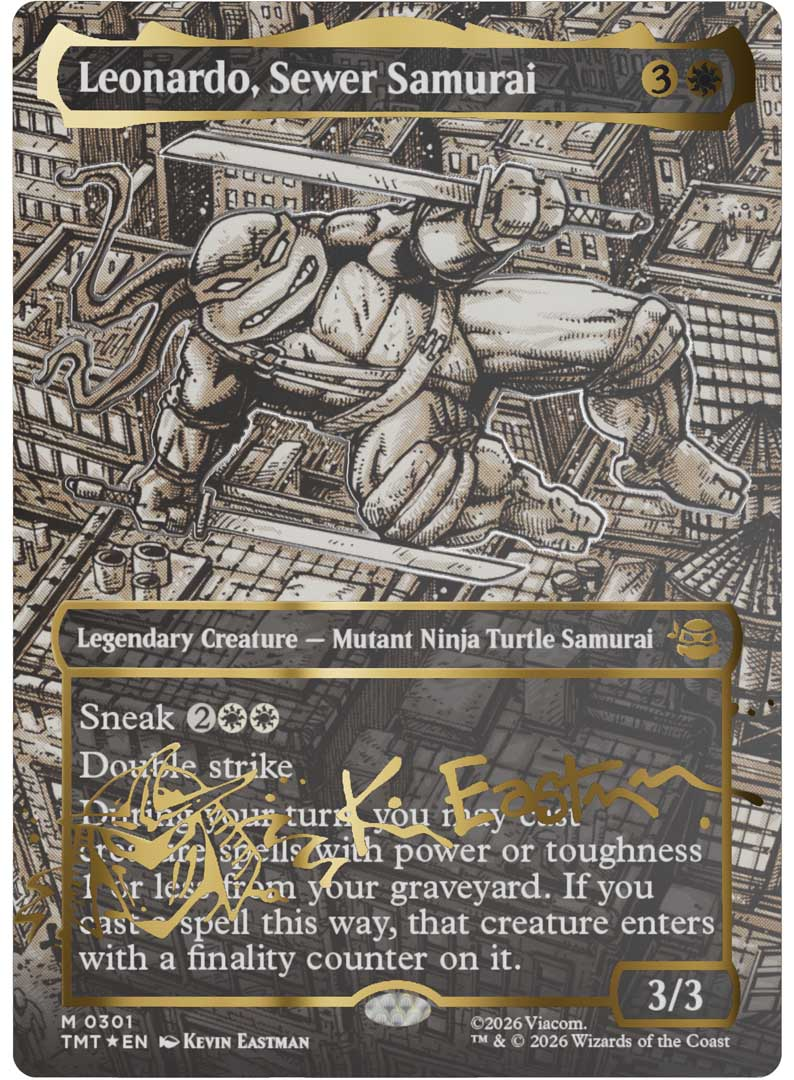 ·由《忍者神龟》原始插画师凯文·伊斯特曼创作的无边框牌。这些卡牌配有原创无边框画作,并带有闪亮的凯文亲笔签名印章