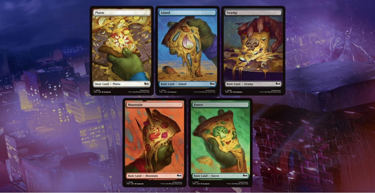 ·大画披萨基本地:神龟对披萨的热爱如此之深,以至于系列的基本地牌中也融入了披萨的元素。五张全画幅披萨基本地牌上铺满了令人垂涎的披萨配料
