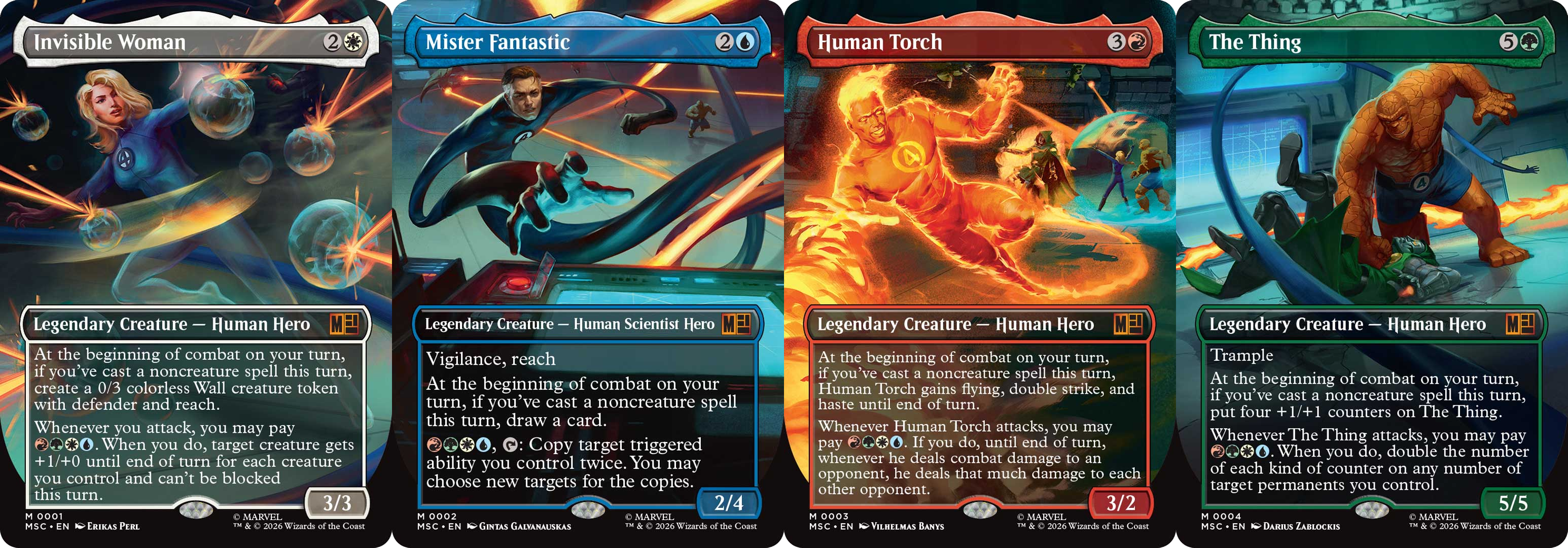 威世智确认,本系列将推出多套拆开即玩的指挥官套牌,让粉丝能直接上手体验万智牌最受欢迎的赛制。玩家们抢先一睹了一套以漫威第一家庭“神奇四侠”为主题的指挥官套牌,神奇先生、隐形女、霹雳火和石头人都将作为封面指挥官登场。