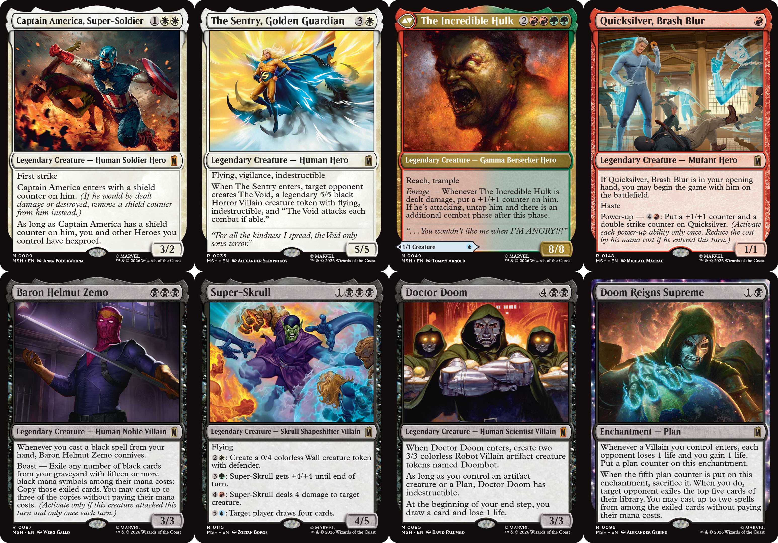 万智牌与漫威宇宙将在这次史诗联动中激烈碰撞——有传奇角色,有强大异能,还有来自漫画的独特叙事魅力。从超级士兵美国队长,到黄金守护者哨兵, 再到绿巨人浩克和快银,本系列展示了漫威丰富的英雄阵容。而有英雄的地方,必有反派紧随其后,漫威宇宙中最臭名昭著的阴谋家也将悉数登场,包括泽莫男爵、超级斯克鲁人以及拉菲维亚的最高统治者毁灭博士。