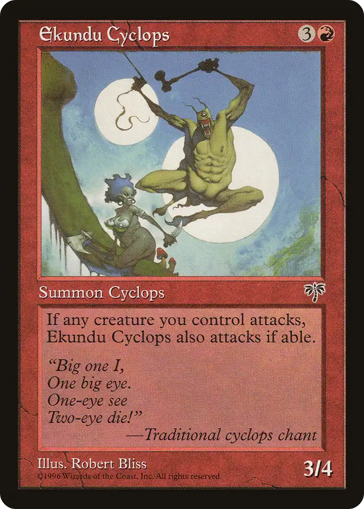 依坎都独眼巨人是海市蜃楼系列的一张普通生物牌。它的规则叙述在概念上很简单。它喜欢攻击,所以如果你有任何生物攻击,它也必须攻击。这很有风味,感觉就像一张普通牌。但有一个问题:牌手总是忘记用他们的依坎都独眼巨人攻击。为什么呢?因为牌手们会专注于正在攻击的生物,而常常忘记检查那些没有攻击的生物的规则。这在比赛中造成了无尽的麻烦,因为用独眼巨人攻击是强制行动,但我们通常不喜欢回溯已经结束的战斗。